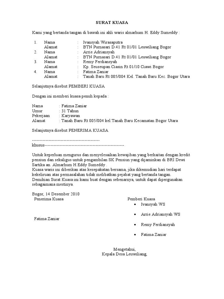 Contoh Surat Kuasa Ahli Waris Bank Belajar Office