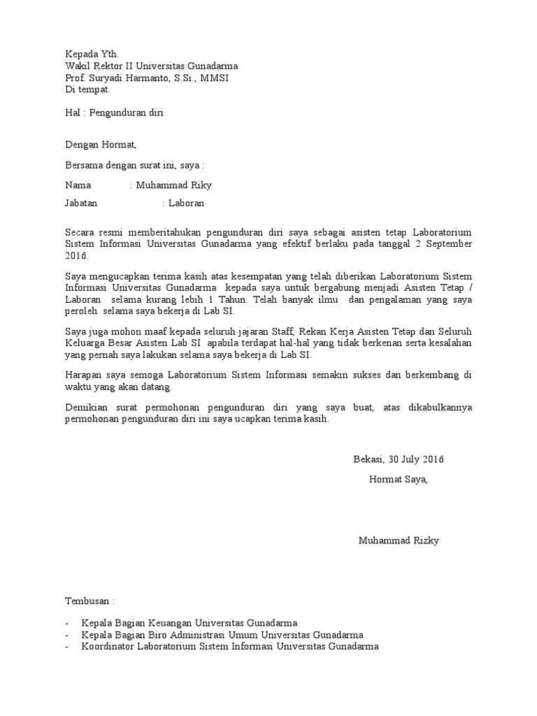 17 contoh surat pengunduran diri resmi yang baik dan sopan contoh surat pengunduran diri contoh surat pengunduran kerja contoh surat resign alasannya bisa berasal dari sesama rekan kerja jenuh dengan lingkungan pekerjaan atau bahkan ada masalah dengan atasan yang dan membuat kita mau tidak mau mengajukan permohonan pengunduran diri. 5 contoh surat pengunduran diri mahasiswa dan dosen seperti saat resign dari pekerjaan mengundurkan diri dari bangku perkuliahan baik sebagai mahasiswa ataupun dosen juga memerlukan yang namanya surat. Biar kalo mau lanjut ke kampus lain gk terkendala administrasi. Di sini kamu bisa mempelajari berbagai contoh surat pengunduran diri yang baik disertai dengan format susunan serta tips untuk membuatnya.