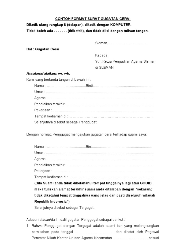 Surat gugatan cerai merupakan surat yang ditujukan kepada pengadilan agama oleh salah satu pihak dari pasangan suami istri yang ingin mengajukan perceraian. Oleh karena itu maka wajib bagi pns yang ingin bercerai untuk. Salah satu syarat administrasi bagi pegawai negeri sipil pns yang ingin mengajukan gugatan perceraian adalah surat izin cerai dari atasan. Nantinya pihak yang mengajukan gugatan akan disebut penggugat sedang pihak yang digugat akan disebut pihak tergugat.