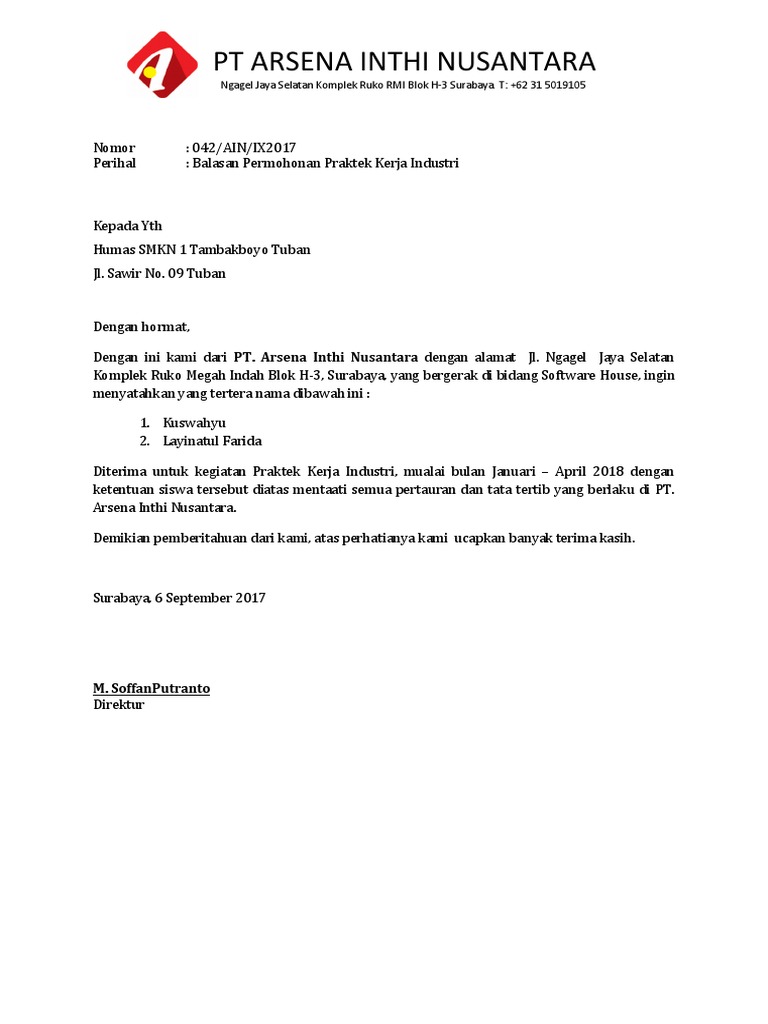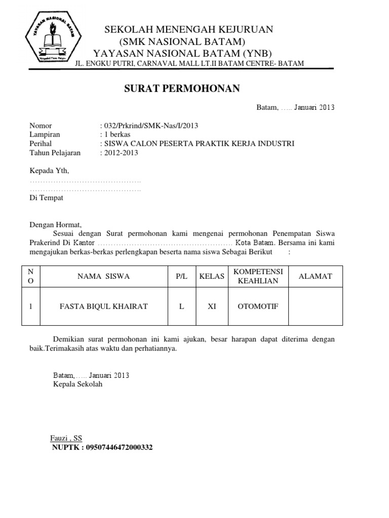 Surat resmi permohonan praktek kerja industri. 15 contoh surat permohonan kerjasama di berbagai bidang sebagai suatu perusahaan yang ingin maju dan berkembang maka tentu harus menjalin kerjasama dengan perusahaan lain maupun berbagai pihak lain. Hormat kami kepala sekolah nama kepala sekolah 5. Contoh surat permohonan magang untuk praktek kerja mahasiswa seperti yang diketahui sistem pendidikan di perguruan tinggi indonesia untuk beberapa program studi tertentu mewajibkan mahasiswa melakukan magang sebagai praktek kerja langsung. 03 smk n 01 hm xii 2014 tanggal 10 desember 2014 perihal permohonan praktek kerja industri kepada mahasiswa.